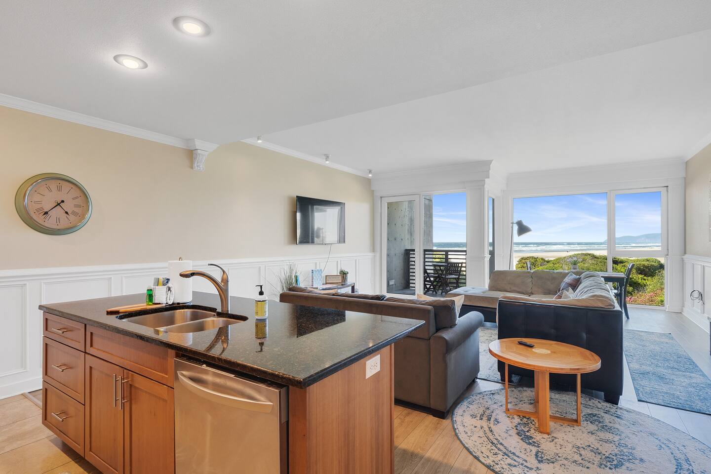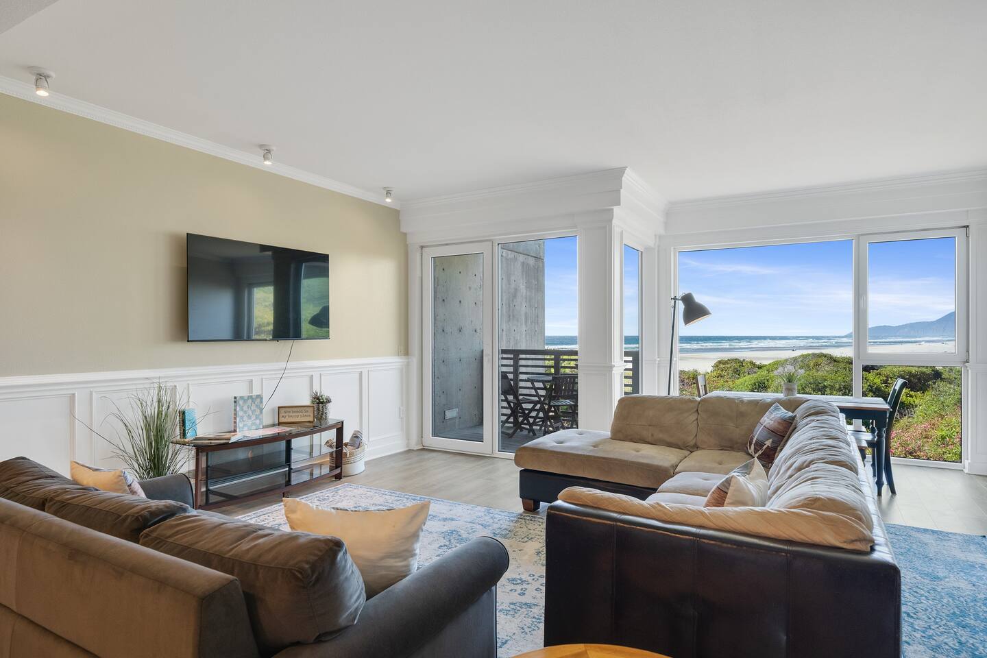 Spacious condo offers a prime ocean front location with easy access to a quiet beach. This location is ideal for couples, families, and friends. But the real treasure is that this amazing view is just as accessible inside - from the couch to the kitchen sink, this condo delivers the waves of the Pacific from every angle. Our condo offers a quiet space due to thick concrete walls and private balconies that can't be seen from other units. Your balcony will feel secluded and private with a prime ocean view for those gorgeous Oregon sunsets. Master bedroom houses a queen sized bed with a private bathroom. You will find a walk-in shower and a large soaking tube. In the second bedroom you will find two double-sized beds with direct access to the hallway bathroom. Both showers are equipped with a detachable handheld shower-head. You also will find plenty of extra blankets, sheets, pillows, and comforters. We have new washer and dryer in the unit, so it makes it easy to toss in a load of laundry, if needed. A well stocked kitchen, including a dishwasher, microwave, toaster, baking sheets, pots, pans, peeler, blender, crock pot, Keurig, and much more. We also have children's silverware, cups, plates, and bowls. We provide an assortment of board games, beach chairs, beach toys for the kids, kites, beach towels, boogie board, and puzzles. Taking a break from the office? Join us at the beach! For remote work, we provide fast internet speeds of 300 mbps, usually sufficient to stream Netflix, YouTube videos, Zoom, and other platforms without issues. We are thrilled to welcome you to our beach condo. We have created this special place for our family of four and we hope you make wonderful memories while visiting Rockaway Beach! *due to close proximity to the beach and the salty air the elevator isn't always in service. Please contact us if you for sure need it working so we can verify it's status. It is currently out of order*